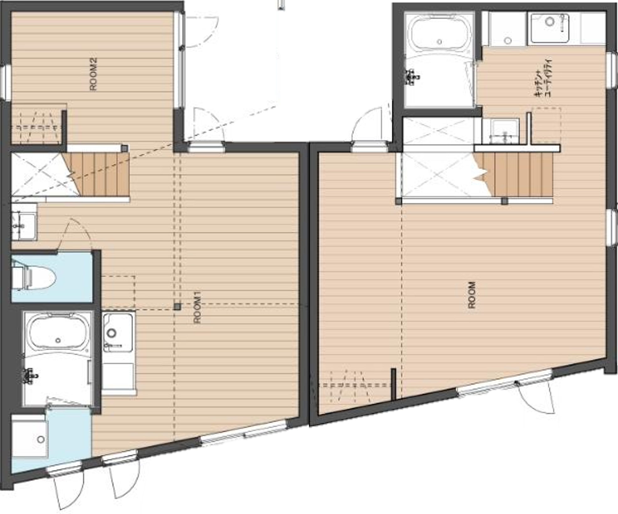 間取り | 2K+ロフト+バイク用ガレージ (1階:バイク用ガレージ) (2階:洋室2部屋(ROOM1+ROOM2、キッチン、バス・トイレ別)) |