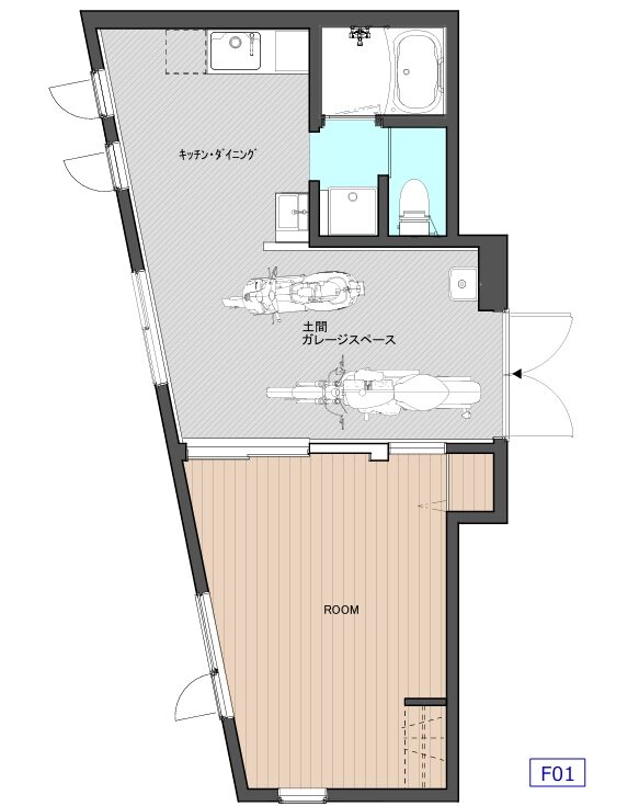 居住スペースをすべて2Fに置くことで、バイク用ガレージと居住性を両立した部屋となります。